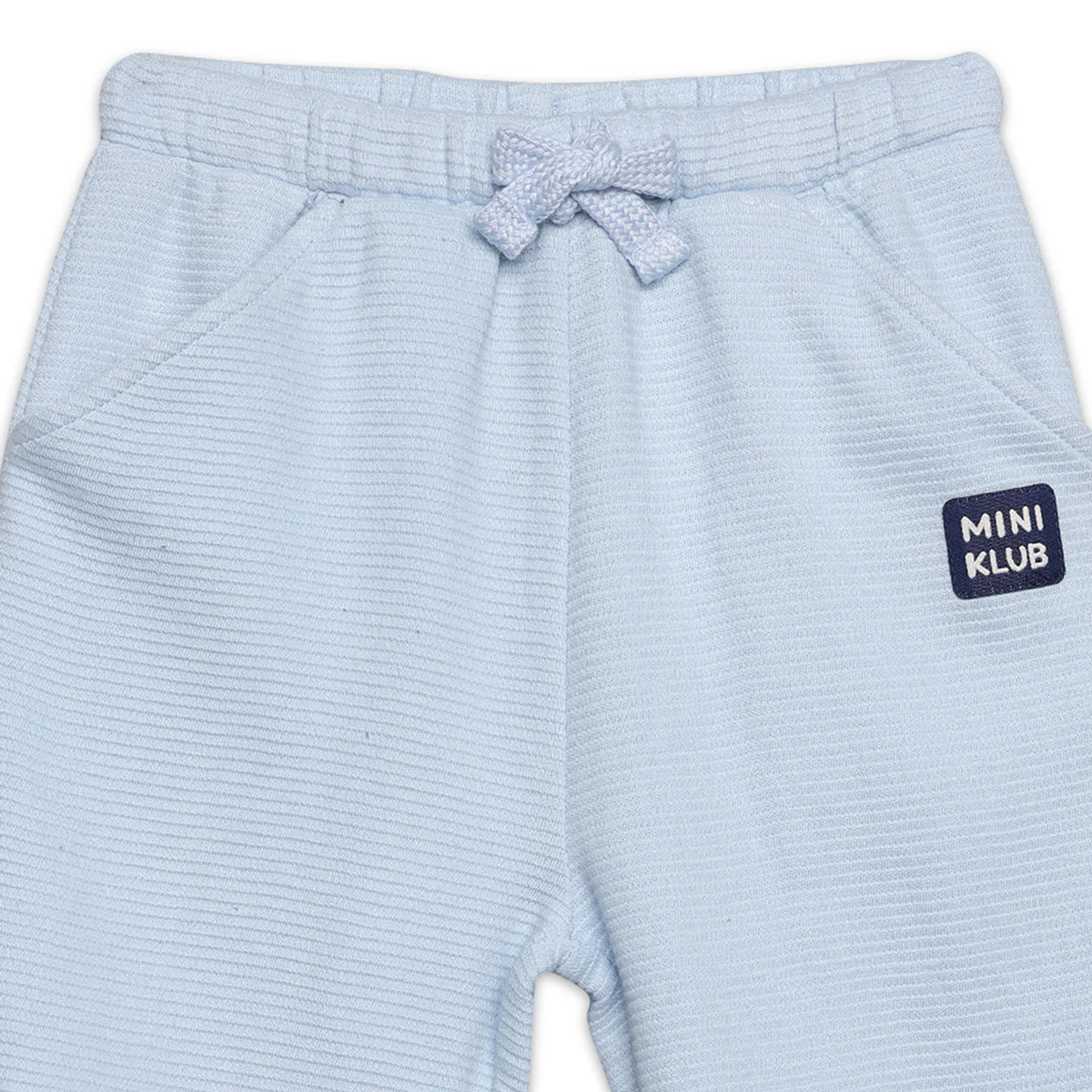 These light blue jogger pants are designed for everyday comfort, made from soft, textured fabric that feels gentle on the skin. Featuring an elastic waistband with a drawstring, side pockets, and elasticated hems, these joggers are perfect for playtime and casual outings.