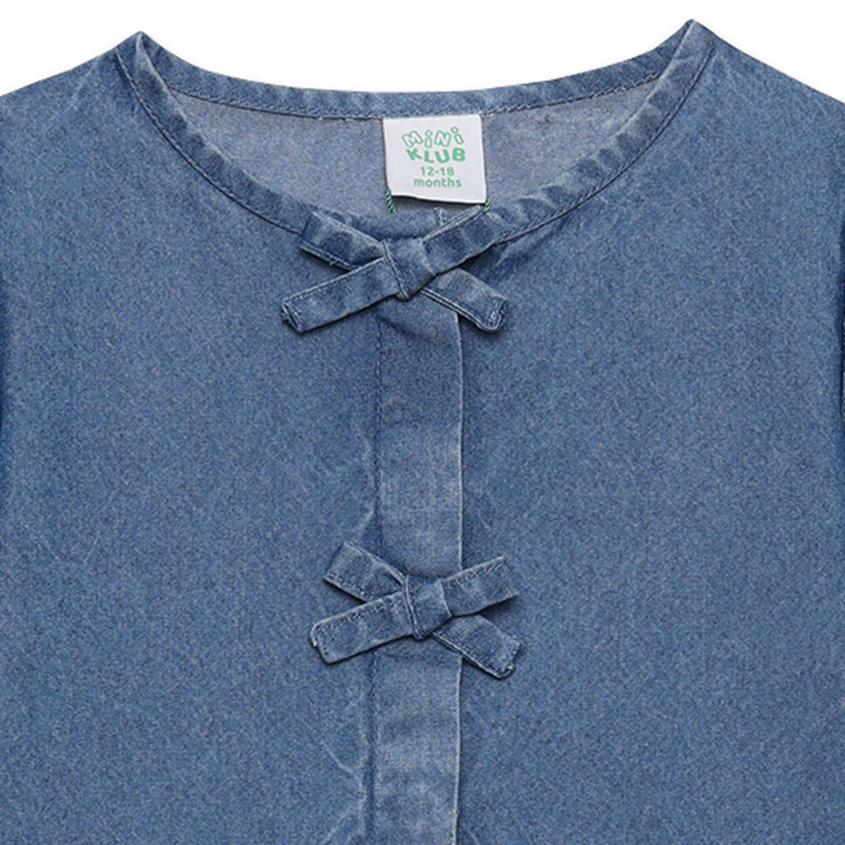 This adorable denim top is a perfect mix of style and comfort for your little girl. Featuring charming bow details along the front and a frilled hem, it adds a touch of elegance to any casual outfit. The soft denim fabric ensures all day comfort, while the full sleeves make it ideal for any season.