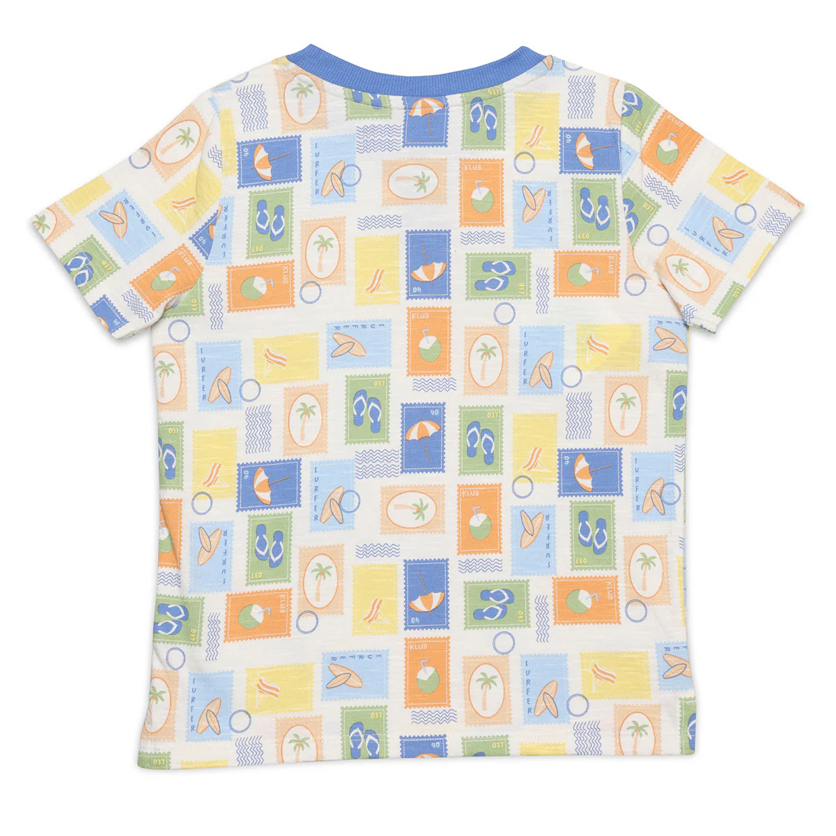 Add a splash of fun to your little one’s summer wardrobe with this colourful beach themed Henley T-Shirt. Featuring an all over print of palm trees, flip flops, and surfboards, it’s perfect for sunny days and outdoor adventures. The contrast blue neckline with button detailing gives it a cute, casual look.